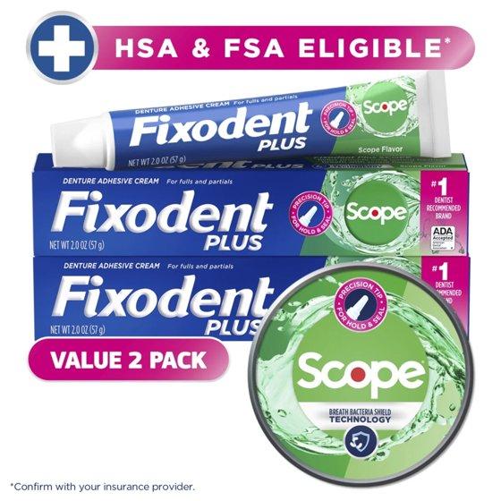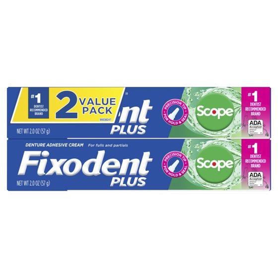 - Two 2 oz tubes of Fixodent Plus Scope Denture Adhesive Cream