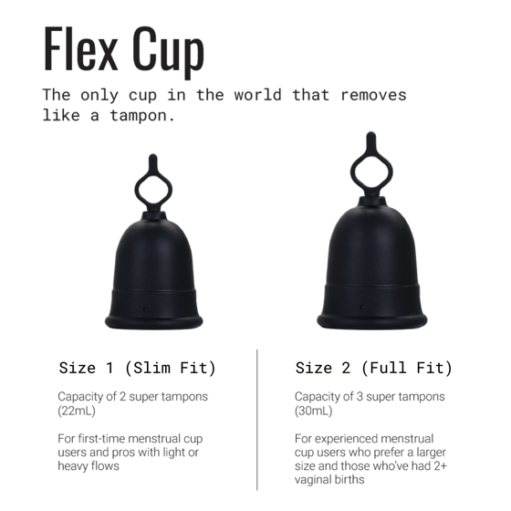FIND YOUR FIT. Flex Cup comes in two sizes to find the perfect fit for your body. Size 01 is ideal for beginners or pro cup users with light to heavy flows and has a capacity of 2 SUPER tampons. Size 02 is ideal for experienced cup users or those who've had 2+ vaginal births and has a capacity of 3 SUPER tampons. If you're unsure where to start, we recommend starting with Size 01.