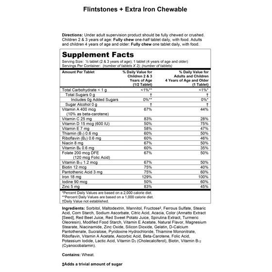 Trusted by parents and pediatricians alike, Flintstones multivitamins have been providing kids nutritional support as they grow up healthy and strong for more than 50 years. Flintstones Chewable Multivitamins with Iron offer a wide range of nutrients in easy-to-chew, fruit-flavored tablets. These daily multivitamins provide vitamins and minerals that growing bodies may need and contain as much iron about 3 cups of cooked spinach! Flintstones Chewables have key nutrients to support physical energy by helping convert food to fuel, while also supporting bone health, immune health, and eye health.* These fun chewable vitamins feature eight classic Flintstones characters. *This statement has not been evaluated by the Food and Drug Administration. This product is not intended to diagnose, treat, cure, or prevent any disease. The Supplement Facts labeling information contained within this website should be regarded as the most up to date and may differ from product labeling that you have purchased. Please consult your product package for information, including allergens, specific to the product you have purchased.