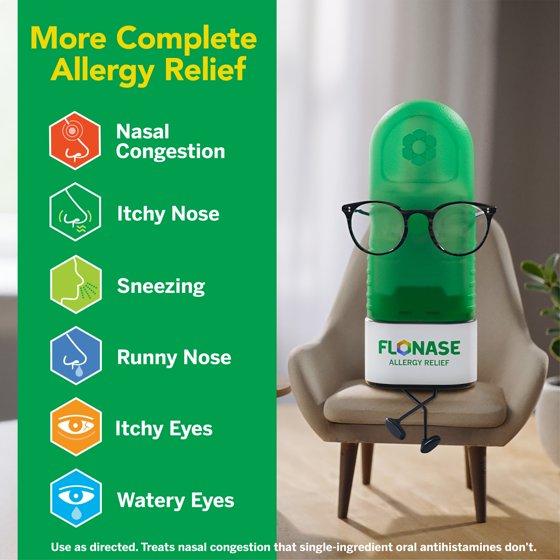 Flonase Allergy Relief Nasal Spray relieves nasal congestion, runny nose, sneezing, itchy nose, and itchy, watery eyes caused by allergens such as pollen, mold, dust, and pet dander. Its non-drowsy, 24-hour formula is perfect for combating seasonal allergies. Whether it's Spring, back-to-school, or Fall, Flonase nasal spray is your trusted solution for year-round allergy relief, recognized as the number 1 doctor recommended brand of allergy medicine (1). By blocking 6 allergic substances (2), Flonase prevents your body from overreacting to allergens. For optimal results, use daily. Simply shake gently, prime the bottle, and administer up to two sprays per nostril (for adults, children 4-11 use 1 spray per nostril per day). Safe for adults and children 4 years and older. Now available in a new recyclable paper package that's easier to open—no scissors needed!