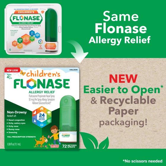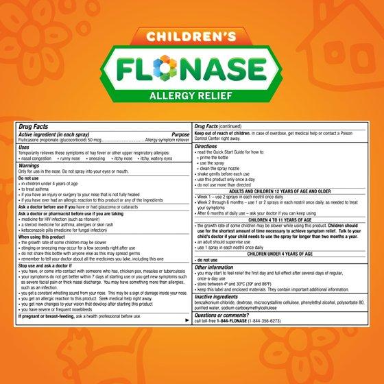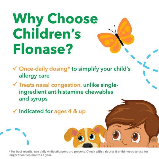 Flonase Children's Allergy Medicine relieves your child's worst allergy symptoms in a non-drowsy formula for year-round, all day indoor and outdoor relief. Unlike most kids allergy medicine, Children's Flonase relieves runny nose, sneezing, itchy nose, itchy eyes and watery eyes, plus nasal congestion.† Children's Flonase contains fluticasone propionate nasal spray, the #1 pediatrician prescribed allergy medicine.†† Easy-to-use Flonase nasal spray helps kids achieve more complete relief of allergy symptoms caused by pollen, mold, dust and pet dander. The non-drowsy allergy medicine for kids ages 4 to 11 is specially formulated for allergy relief to keep kids energized and focused throughout the day. To use: once daily, place the small nozzle tip inside the child's nose and spray gently in each nostril. †Vs. single¬-ingredient antihistamines which do not contain a nasal decongestant. †† Based on the Cumulative IMS Prescription Data Jan 2015 – Sep 2020.