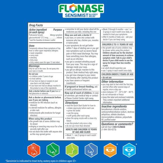 Flonase Sensimist Allergy Relief Nasal Spray relieves nasal congestion plus runny nose, sneezing, itchy nose, and itchy, watery eyes (1) with a fine mist that is scent free. This allergy spray is full prescription strength, offering non-drowsy, 24-hour, long-lasting relief of allergy symptoms caused by allergens, including pollen, mold, dust, and pet dander. To use, shake the bottle vigorously, prime the bottle for use by pumping until a fine mist appears, then spray up to two sprays directly in each nostril (for adults, children 2-11 use 1 spray per nostril per day). This allergy spray is formulated for daily use in adults and children 2 years and older. (1) Flonase Sensimist is indicated for itchy, watery eyes in adults and children 12 years of age and older (2) Flonase acts on multiple inflammatory substances (histamine, prostaglandins, cytokines, tryptases, chemokines, and leukotrienes). The exact number of mediators and precise mechanisms are unknown