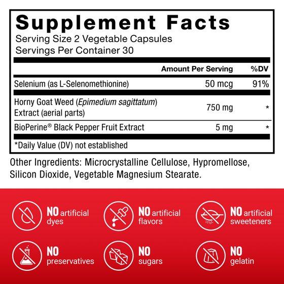 Selenium (as L-Selenomethionine), Horny Goat Weed (Epimedium sagittatum) Extract (aerial parts), BioPerine® Black Pepper Fruit Extract, Microcrystalline Cellulose, Hypromellose, Silicon Dioxide, Vegetable Magnesium Stearate.
