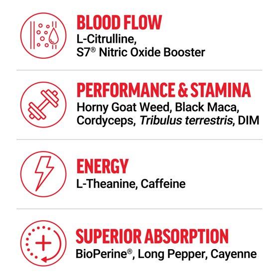 Calcium (as Dicalcium Phosphate); Zinc (as Zinc Aspartate); L-Citrulline, S7 (Green Coffee (Coffea arabica) Extract (bean), Green Tea (Camellia sinensis) Extract (leaf), Turmeric (Curcuma longa) Extract (rhizome), Tart Cherry (Prunus cerasus) Powder (fruit), Blueberry (Vaccinium corymbosum) Powder (fruit), Broccoli (Brassica oleracea italica) Powder (head), Kale (Brassica oleracea acephala) Powder (leaf)); Panax ginseng Extract (root); Giant Knotweed (Polygonum cuspidatum) Extract (root) (std. for trans-resveratrol); Horny Goat Weed (Epimedium grandiflorum) Extract (aerial parts); Horny Goat Weed (Epimedium sagittatum) Extract (aerial parts); Black Maca (Lepidium meyenii) Extract (root); Tribulus terrestris Extract (fruit); Ginkgo (Ginkgo biloba) Extract (leaf); Cordyceps (Cordyceps sinensis) Extract (mycelium); DIM (Diindolylmethane); L-Theanine; Coffea robusta Extract (bean) (std. to caffeine); Theobroma cacao Extract (bean); BioPerine® Black Pepper Fruit Extract; Long Pepper (Piper longum) Extract (fruit and leaf); Cayenne Pepper (Capsicum annuum) Powder (fruit and seed). Other Ingredients: Microcrystalline Cellulose; Croscarmellose Sodium; Stearic Acid; Silicon Dioxide; Magnesium Stearate; Hypromellose; Polydextrose; Titanium Dioxide; FD&C Blue #1; Talc; Maltodextrin; Medium-Chain Triglycerides; Natural Flavor