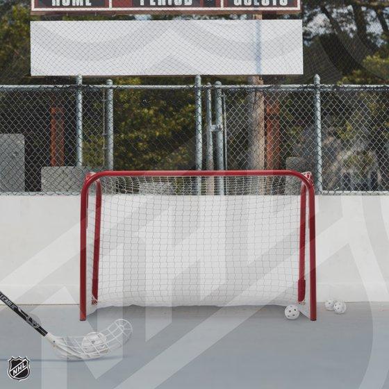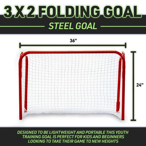 The Franklin Sports 36" x 24" hockey goal is perfect for anyone looking to play in the driveway, yard or on a pond! It is easily transported with its folding design as well as comes almost fully assembled to quickly let the games begin! It is easily stored by pressing down and swinging the sides of the goal posts inward. It comes with a lightweight pre-fit net and has steel 1" posts. This is a recreational goal designed for fun!