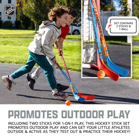 - PROMOTES OUTDOOR PLAY: Including 2 sticks for 1-on-1 play, this hockey stick set helps get kids up off the couch and promotes active outdoor play with friends