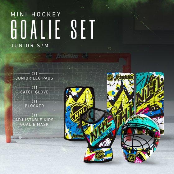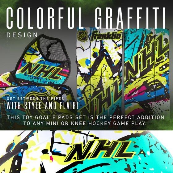 Franklin Sports NHL Youth Knee Hockey Goalie Pads + Helmet Set - Kids Knee + Mini Hockey Goalie Gear + Equipment - (2) Leg Pads, Catch Glove, Blocker + Mask Included - Graffiti