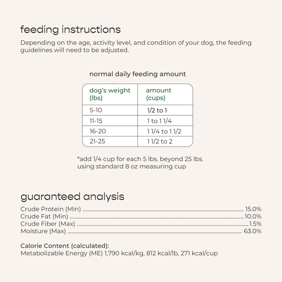 Beef, Chicken, Beef Liver, Lentils, Eggs, Green Beans, Sweet Potatoes, Carrots, Pea Fiber, Natural Flavors, Spinach, Vinegar, Cultured Dextrose, Salt, Fish Oil, Celery Powder, Vitamins (Choline Chloride, Vitamin E Supplement, Vitamin B12 Supplement, Calcium Pantothenate, Biotin, Niacin, Riboflavin, Thiamine Mononitrate, Pyridoxine Hydrochloride, Folic Acid), Minerals (Zinc Proteinate, Iron Proteinate, Copper Proteinate, Manganese Proteinate, Sodium Selenite, Calcium Iodate).