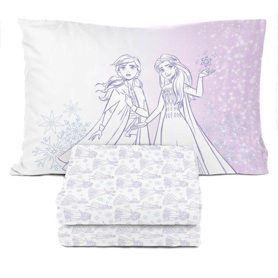 Liven up your child's room with this Disney Frozen Winter Frost Adventure 3-piece twin sheet set! This twin sheet set includes one fitted sheet (39" x 75" x 10"), one flat sheet (66" x 96"), and one reversible standard pillowcase (20" x 30"). Your child will love this adorable water color design featuring a purple and white Elsa, Ana, and snowflake pattern. Made with 100% high-quality polyester, these sheets feel great to the touch and are gentle on your child's skin. Jay Franco products are easy to care for. This sheet set is made from machine washable polyester. Complete the look by shopping the rest of our Disney Frozen bedding collection sold separately on!