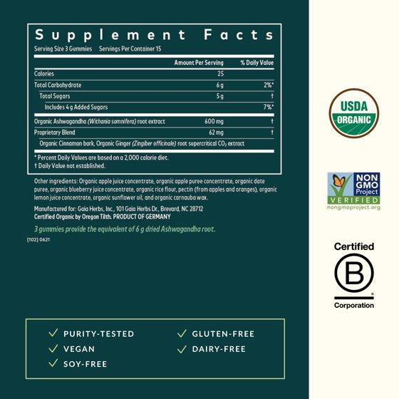 - Adaptogen Support: Each serving of Gaia Herbs Organic Ashwagandha Gummies delivers the equivalent of 6 grams of ashwagandha*