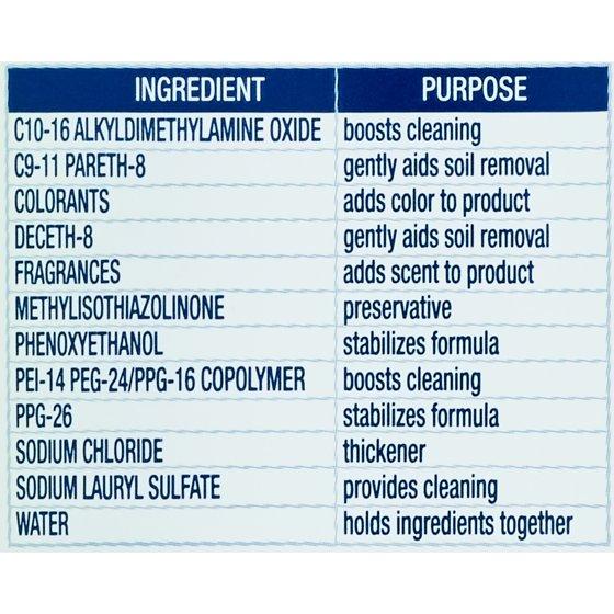 Alcohol Denatured, C10-16 Alkyldimethylamine Oxide, C9-11 Pareth-8, Colorants, Deceth-8, Fragrances, Methylisothiazolinone, PEI-14 PEG-24/PPG-16 Copolymer, Phenoxyethanol, PPG-26, Sodium Chloride, Sodium Citrate, Sodium Lauryl Sulfate, Tetrasodium Glutamate Diacetate, Water