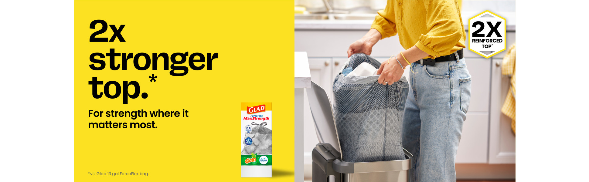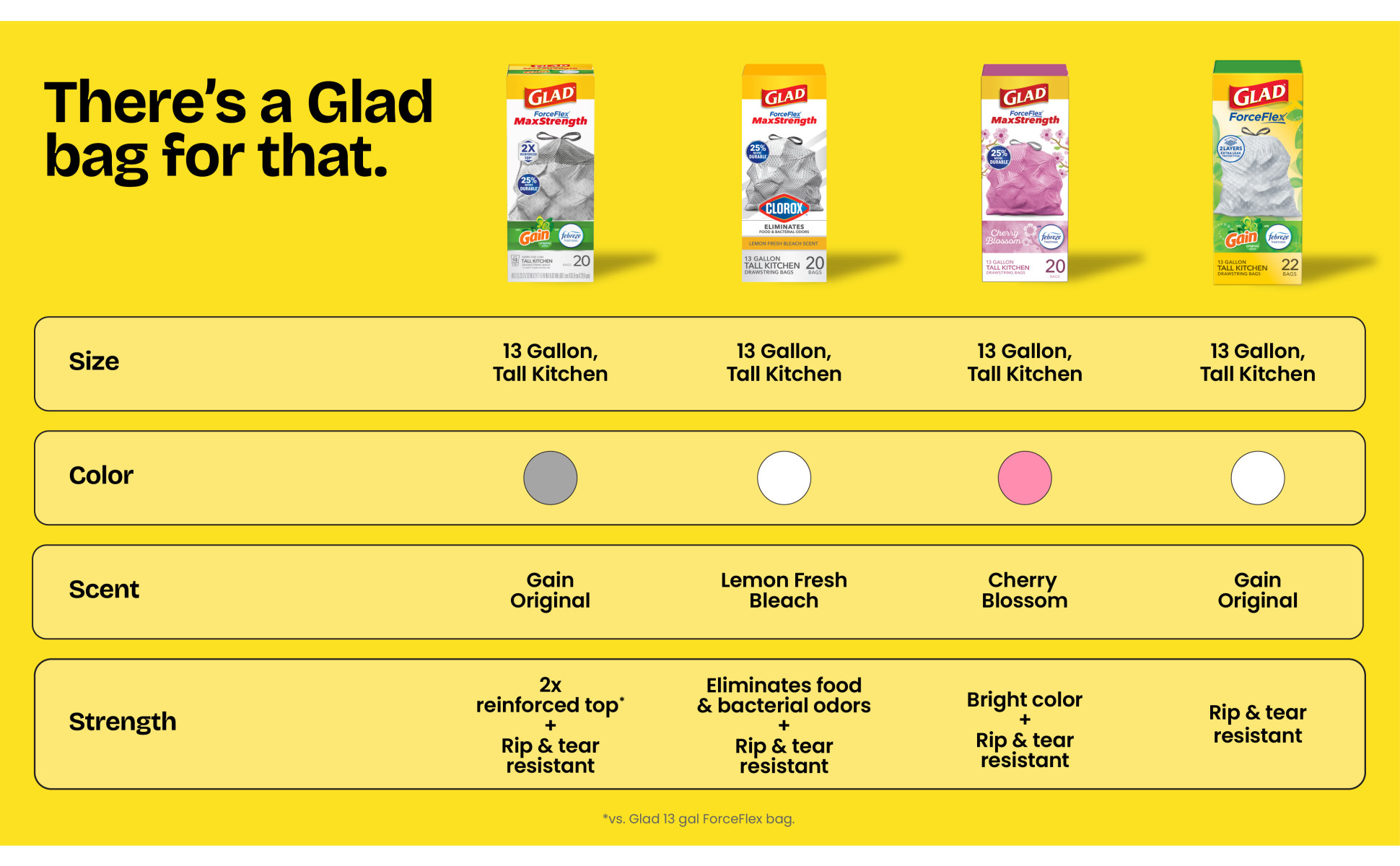 - 25% MORE DURABLE (2): These Glad ForceFlex MaxStrength Tall Kitchen Trash Bags are 25% more durable versus Glad 13 gallon ForceFlex tall kitchen bags