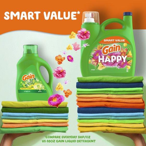 - Includes 154 fl oz of Gain Liquid Laundry Detergent, Happy, Hibiscus Hula, enough for 107 loads