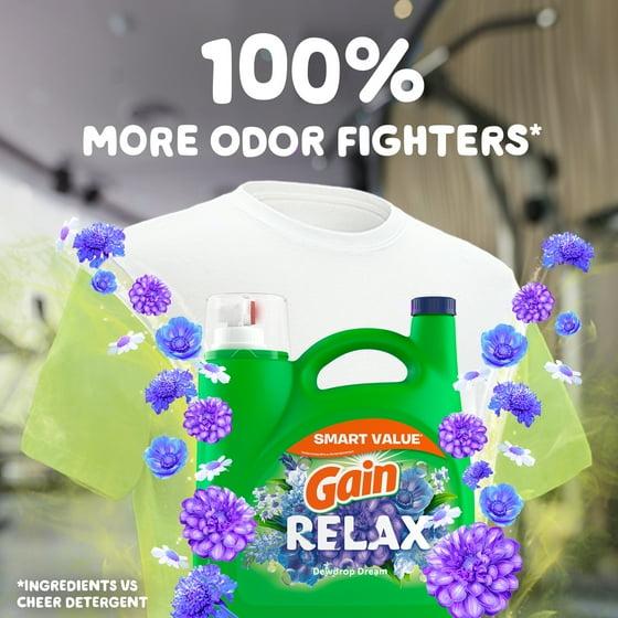 Sniff the good vibes that the new Gain Liquid Laundry Detergent bring. Packed with 75% more fresh ingredients*, Gain Laundry Detergent transforms your laundry routine from a boring chore to an entire aromatic vibe. Now you can treat your nose to a premium scent experience after every wash. Just pour Gain Laundry Detergent with Relax scent to turn the mood down low and chill in the presence of relaxing freshness. 154 fluid ounces, 107 loads. *Freshness ingredients vs. Cheer Liquid Detergent.