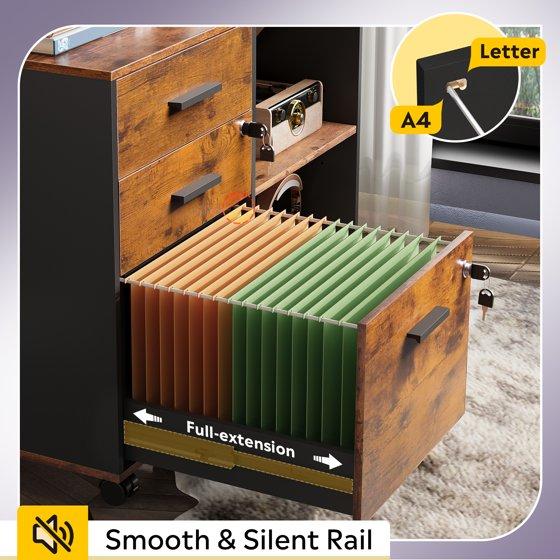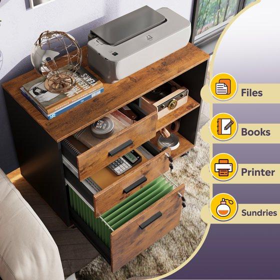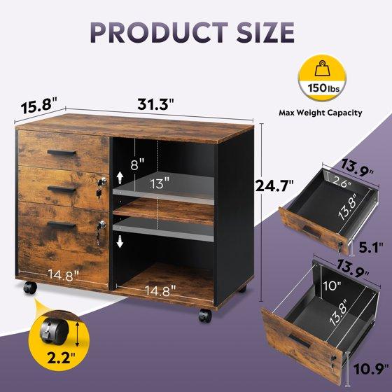 GALAXHERO 3-Drawer Locking Wood File Cabinet, Mobile Lateral Filing Cabinet, Printer Stand with Open Storage Shelves for Home Office, Rustic Brown