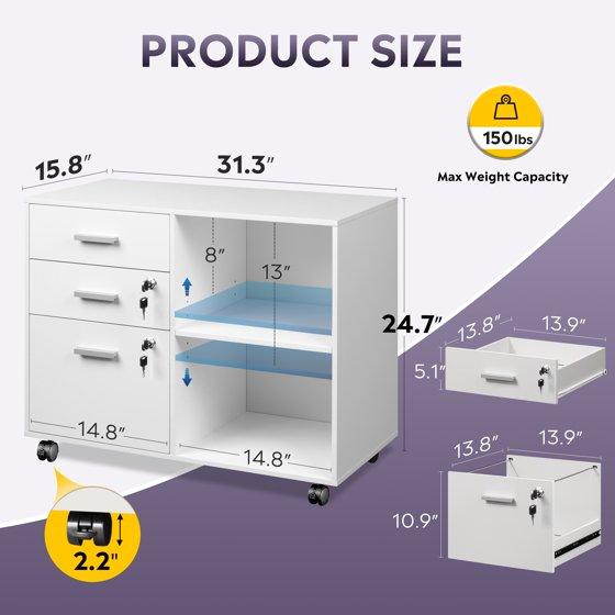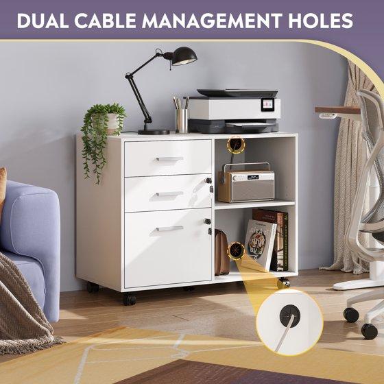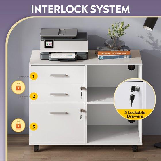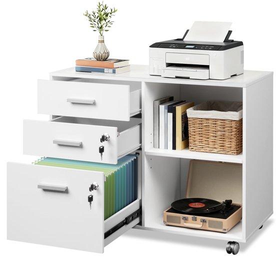 GALAXHERO 3-Drawer Locking Wood File Cabinet, Mobile Lateral Filing Cabinet, Printer Stand with Open Storage Shelves for Home Office, White