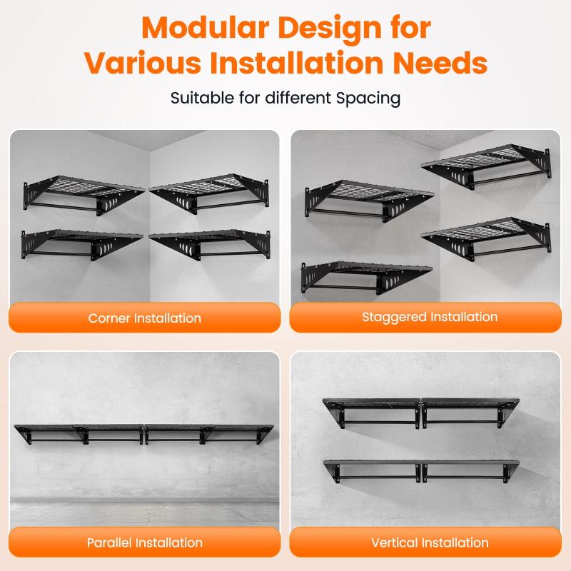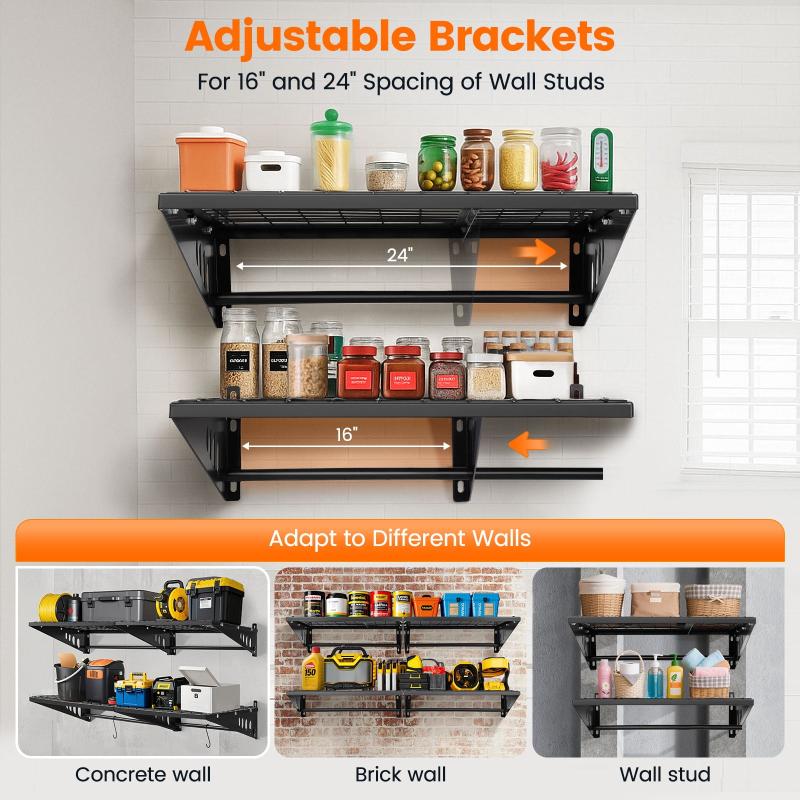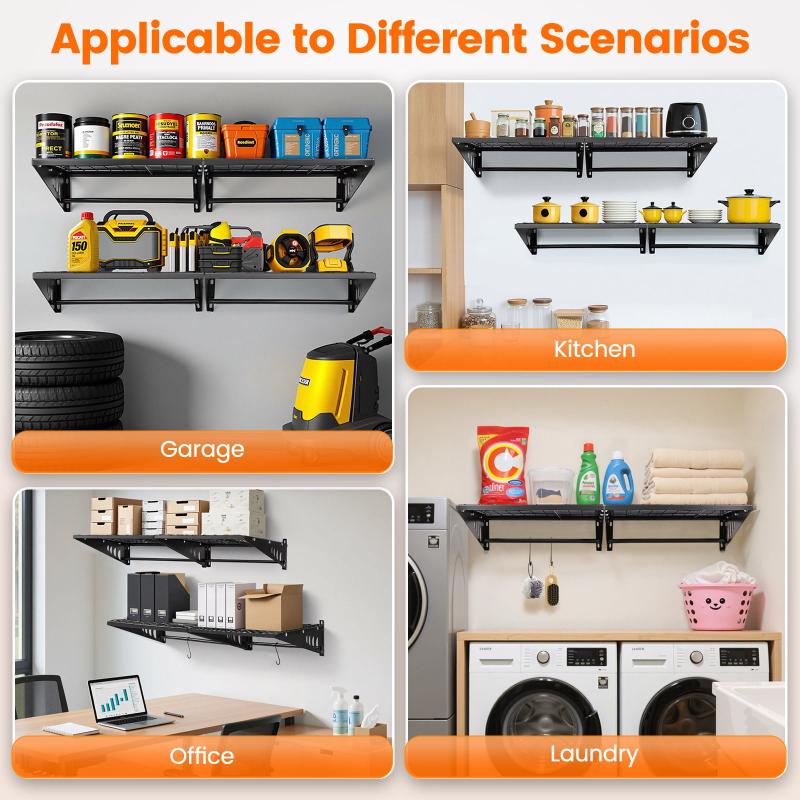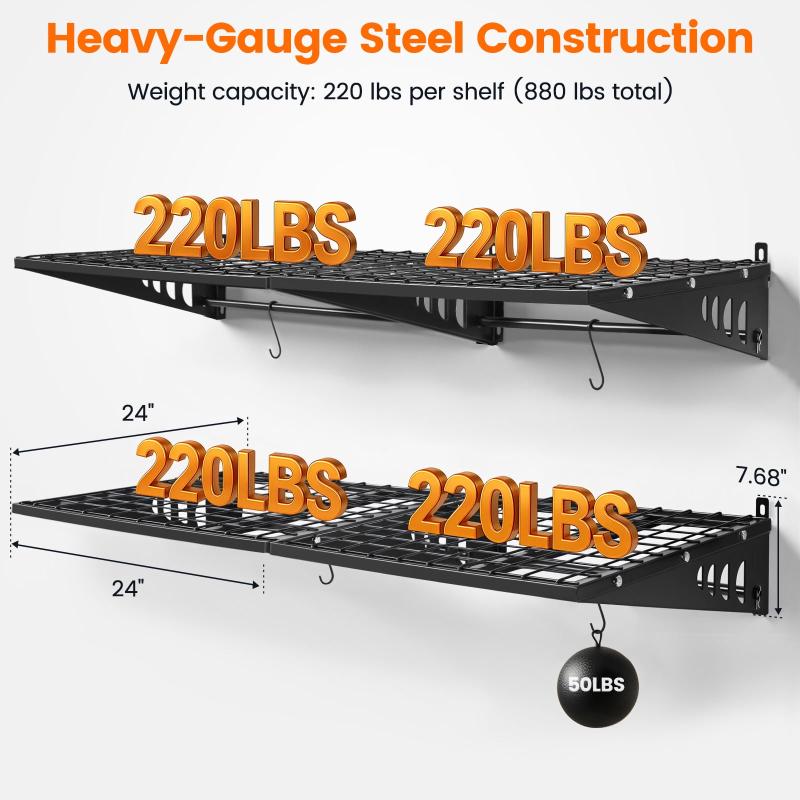 - 【Heavy Duty Garage Shelving】:Our 2-Pack wall-mounted shelves provide generous storage, featuring 4FT shelves per unit. Built from heavy-duty steel, each shelf holds up to 220 lbs, offering a combined capacity of 880 lbs. Ideal for garages, warehouses, offices, and beyond, these shelves are designed for durability, stability, and efficient space organization.