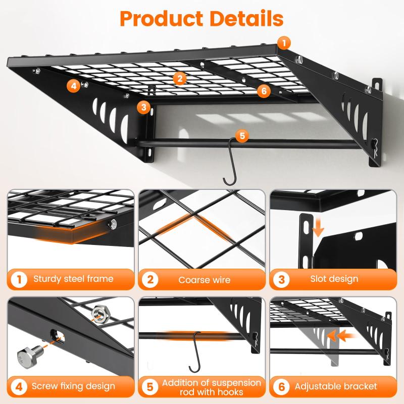 - 【Premium Strength & Stability】:Engineered with heavy-duty steel, our wall shelf system features reinforced square tube supports, a seamless integrated frame, and secure U-hooks for superior durability. Every component undergoes rigorous quality testing to ensure maximum safety and long-lasting performance.