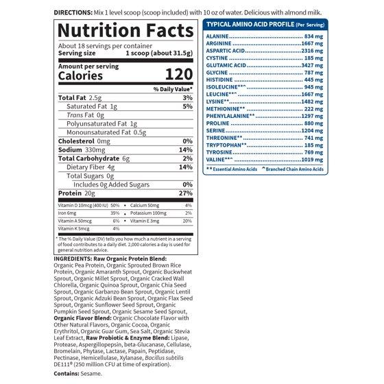 Raw Organic Protein Blend: Organic Pea Protein, Organic Sprouted Brown Rice Protein, Organic Amaranth Sprout, Organic Buckwheat Sprout, Organic Millet Sprout, Organic Cracked Wall Chlorella, Organic Quinoa Sprout, Organic Chia Seed Sprout, Organic Garbanzo Bean Sprout, Organic Lentil Sprout, Organic Adzuki Bean Sprout, Organic Flax Seed Sprout, Organic Sunflower Seed Sprout, Organic Pumpkin Seed Sprout, Organic Sesame Seed Sprout, Organic Flavor Blend: Organic Chocolate Flavor with Other Natural Flavors, Organic Cocoa, Organic Erythritol, Organic Guar Gum, Sea Salt, Organic Stevia Leaf Extract, Raw Probiotic & Enzyme Blend: Lipase, Protease, Aspergillopepsin, beta-Glucanase, Cellulase, Bromelain, Phytase, Lactase, Papain, Peptidase, Pectinase, Hemicellulase, Xylanase, Bacillus subtilis DE111® (250 million CFU at time of expiration). Contains: Sesame. Made without dairy or soy ingredients, tree nuts, added sugars nor filler ingredients. Manufactured in a facility that also processes egg, milk, soy, wheat, fish, tree nuts and sesame. May contain traces of soy due to agricultural practices.