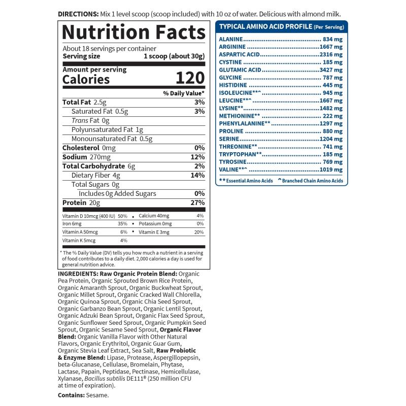 Raw Organic Protein Blend: Organic Pea Protein, Organic Sprouted Brown Rice Protein, Organic Amaranth Sprout, Organic Buckwheat Sprout, Organic Millet Sprout, Organic Cracked Wall Chlorella, Organic Quinoa Sprout, Organic Chia Seed Sprout, Organic Garbanzo Bean Sprout, Organic Lentil Sprout, Organic Adzuki Bean Sprout, Organic Flax Seed Sprout, Organic Sunflower Seed Sprout, Organic Pumpkin Seed Sprout, Organic Sesame Seed Sprout, Organic Flavor Blend: Organic Vanilla Flavor with Other Natural Flavors, Organic Erythritol, Organic Guar Gum, Organic Stevia Leaf Extract, Sea Salt, Raw Probiotic & Enzyme Blend: Lipase, Protease, Aspergillopepsin, beta-Glucanase, Cellulase, Bromelain, Phytase, Lactase, Papain, Peptidase, Pectinase, Hemicellulase, Xylanase, Bacillus subtilis DE111® (250 million CFU at time of expiration). Contains: Sesame. Made without dairy or soy ingredients, tree nuts, added sugars nor filler ingredients. Manufactured in a facility that also processes egg, milk, soy, wheat, fish, tree nuts and sesame. May contain traces of soy due to agricultural practices.