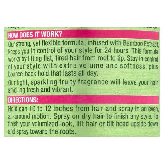 Want voluminous lift and hold without crunchy stiffness? Garnier® Fructis® Style Volume Anti-Humidity Hairspray is a versatile volumizing hairspray that provides the body and fullness you need and the natural, healthy-looking movement you want. With 24 hour hold and anti-humidity protection, your style stays touchable all day long, even in extreme humidity. HOW DOES IT WORK? Our strong, yet flexible hairspray formula, infused with natural Bamboo Extract, keeps you in control of your style for 24 hours. This formula works by lifting flat, tired hair from root to tip. Stay in control of your style with extra volume and softness, plus bounce-back hold that lasts all day. Our light, sparkling fruity fragrance will leave your hair smelling fresh and vibrant. GET INSPIRED! Use any Garnier® Fructis® Style product with Volume Hairspray to boost any style. For best results, use Garnier® Fructis® Full & Plush System of shampoo, conditioner and treatment. For more looks, tips and fun visit our Style Hub.