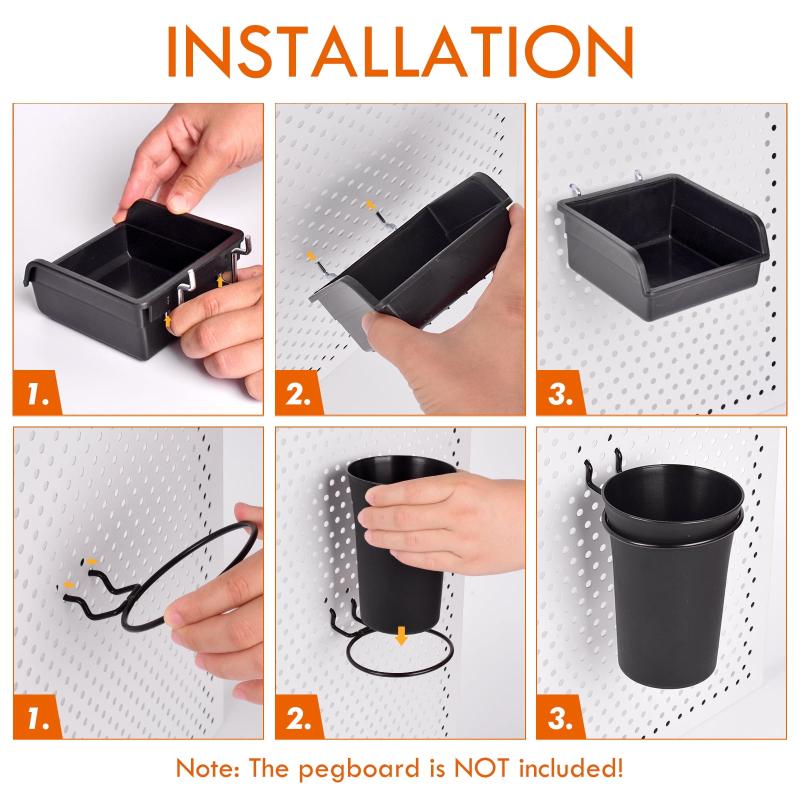 - Convenient Metal Hooks: More easy to install or disassemble these pegboard sets, no need to access the back of your pegboard, and accurate hardware size. Universal Fit for 1/8" and 1/4" pegboards with 1" spacing. With angled hooks attachment, more stable locked into pegboard holes, bins and cups will always sit on the board well, never falling out when usage