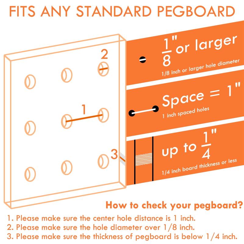 - High Compatibility: Fit all metal, wooden or plastic pegboards with 1/8" and 1/4" hole diameter with 1" hole spacing. (How to check your pegboard? Step 1: Please make sure the center hole distance is 1 inch. Step 2: Please make sure the holes are more than 1/8 inch in diameter. Step 3: Please make sure the thickness of the pegboard is less than 1/4 inch.)
