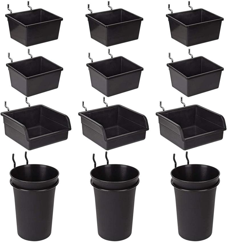 - Heavy Duty Multi-pack: Bins, trays, and cups made from high-density hard plastic, hooks, and hoops made from high-quality thickening steel, sturdy and durable, anti-rust plated finish. 6 pieces peg board bins of small size 3.54(L) x 3.15(W) x 1.77(H) inches, 3 pieces peg board bins of bigger size 3.94(L) x 3.94(W) x 1.97(H) inches, 3 pieces holder cups of size 3.35 - 2.36(D) x 4.72(H) inches