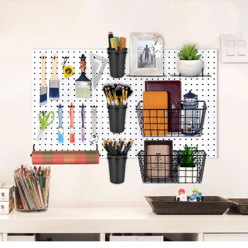 - Handy & Easy: All parts are easy installation and do not wobbly and fall during usage. This contemporary design combines basket bins, cups, tape holders, and hooks together, not only for garage hardware tool storage, but can be used for craft organizers, like scrapbooking, pencils, paintbrushes, ribbons, fasteners, and any art supplies.