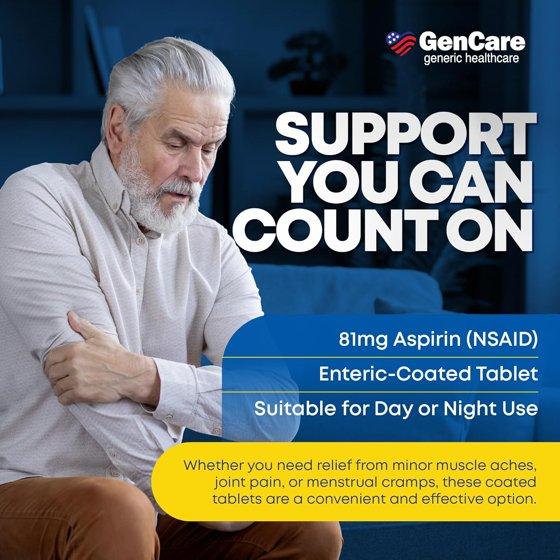 No worries, we got you! GenCare low dose aspirin meds provide effective temporary relief for muscle pain, menstrual pain, and minor pain of arthritis. Each tablet contains 81 mg of aspirin. Aspirin is an NSAID (nonsteroidal anti-inflammatory drug) known for its pain-relieving properties.