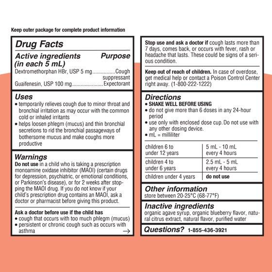 Active: Dextromethorphan and Guaifenesin. Inactive: Organic Agave, Organic Natural Flavor, Water, Organic Natural Citrus Extract, Organic Blueberry Flavor