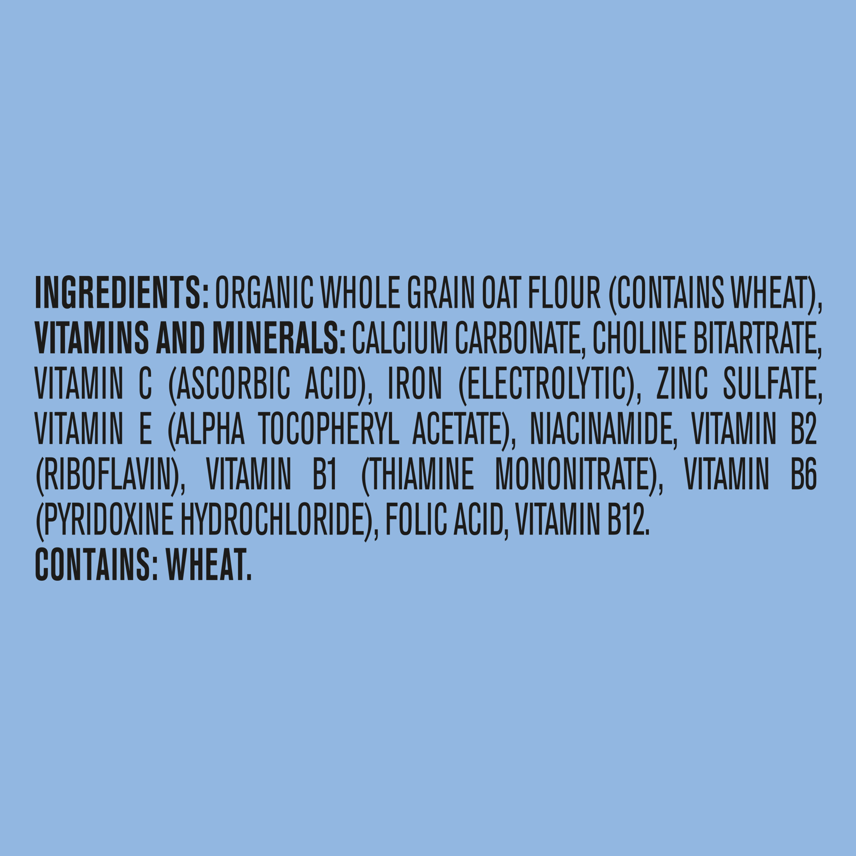 INGREDIENTS: ORGANIC WHOLE GRAIN OAT FLOUR (CONTAINS WHEAT), VITAMINS AND MINERALS: CALCIUM CARBONATE, CHOLINE BITARTRATE, VITAMIN C (ASCORBIC ACID), IRON (ELECTROLYTIC), ZINC SULFATE, VITAMIN E (ALPHA TOCOPHERYL ACETATE), NIACINAMIDE, VITAMIN B2 (RIBOFLAVIN), VITAMIN B1 (THIAMINE MONONITRATE), VITAMIN B6 (PYRIDOXINE HYDROCHLORIDE), FOLIC ACID, VITAMIN B12.