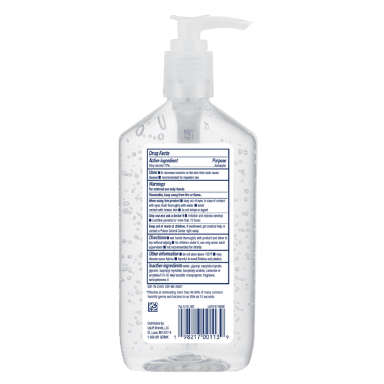 - Clear gel formula with 70% USP grade alcohol supports hand care, a convenient option when soap and water are unavailable.