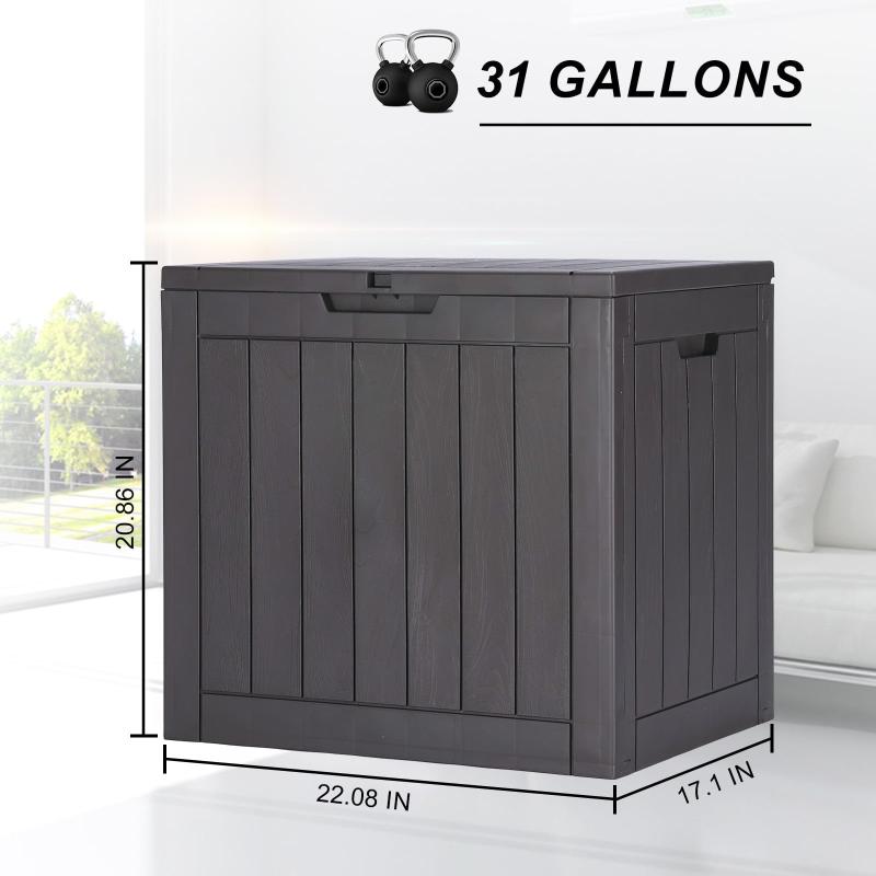 - Compact But Versatile: outdoor storage box measures 22.8''L x 17.1''W x 20.86'H. Even with a storage capacity of 31 gallons, you can fit many backyard extras like patio mats, pillows, pool accessories, gardening tools and hoses, etc