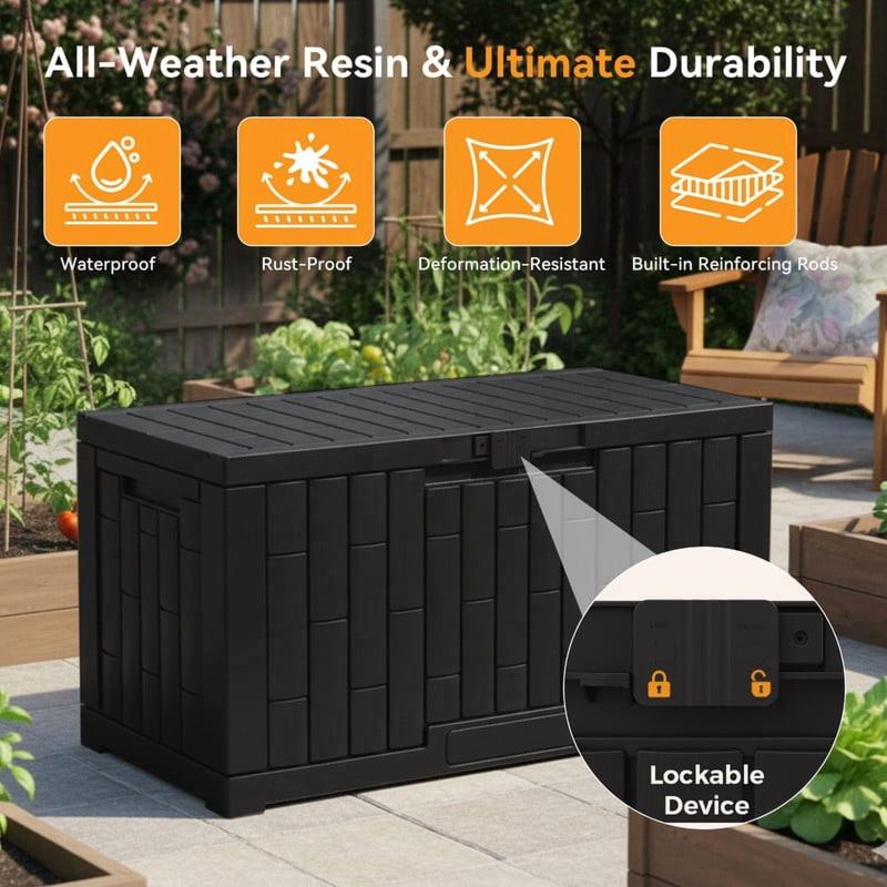 - All-Weather Durable & Waterproof Storage Container: Built to endure harsh conditions, the Dumos waterproof deck box is made from UV-resistant resin that prevents rust, peeling, and dents. Reinforced internal bars ensure this storage box won’t warp or deform under sunlight, making it a truly weatherproof outdoor storage container.