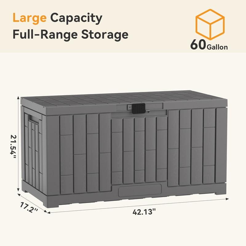 - Spacious & Versatile Deck Box with Lockable Lid: Generous 60-gallon capacity in the Dumos deck box—ideal for storing patio cushions, gardening tools and BBQ accessories. This large storage box easily organizes indoor and outdoor clutter, also doubling as a sturdy bench and a multifunctional storage bin.