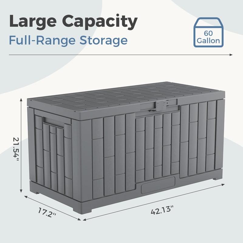 - Spacious & Versatile Deck Box with Lockable Lid: Generous 60-gallon capacity in the Dumos deck box—ideal for storing patio cushions, gardening tools and BBQ accessories. This large storage box easily organizes indoor and outdoor clutter, also doubling as a sturdy bench and a multifunctional storage bin.