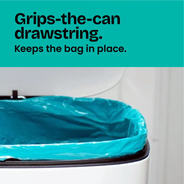 - GRIPS-THE-CAN DRAWSTRING: Durable 3-ply drawstring grips the can so the garbage bag stays in place and makes it easy to close and carry out the trash with no fear of leaks or tears