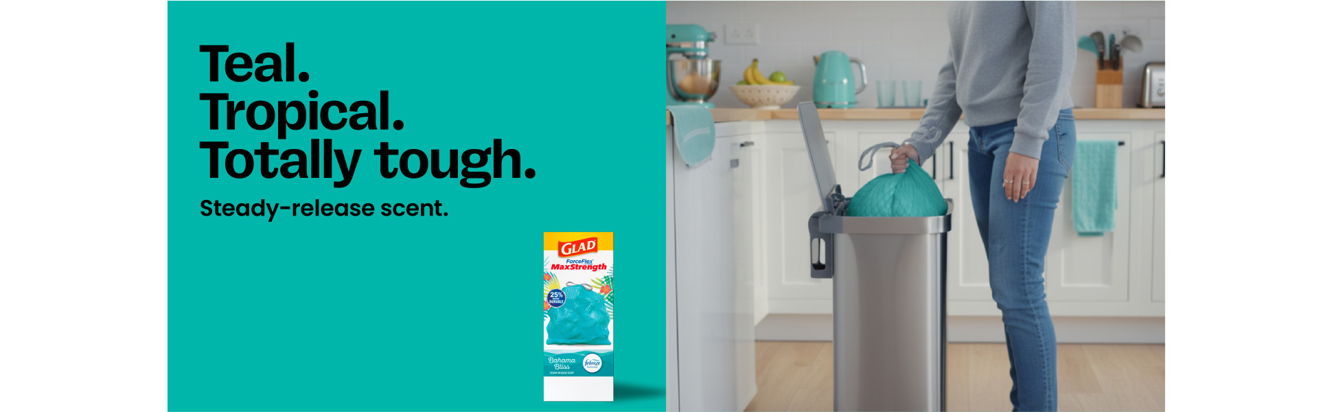 - SCENTED GARBAGE BAGS: Bahama Bliss scent with Febreze freshness works to trap odors and help eliminate garbage smells in the kitchen, while the teal color adds an aesthetic touch
