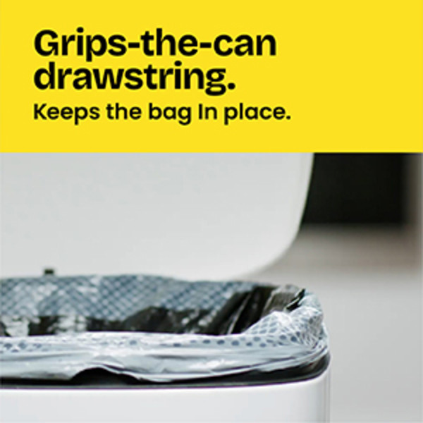 - GRIPS-THE-CAN DRAWSTRING: Durable 3-ply drawstring grips the can so the garbage bag stays in place and makes it easy to close and carry out the trash with no fear of leaks or tears