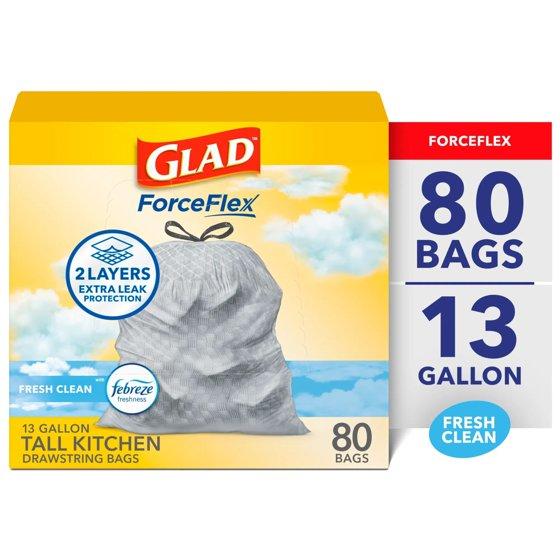 Glad ForceFlex Tall Kitchen Drawstring Trash Bags, 13 gallon, Gain Fresh Clean with Febreze Freshness, 80 Bags