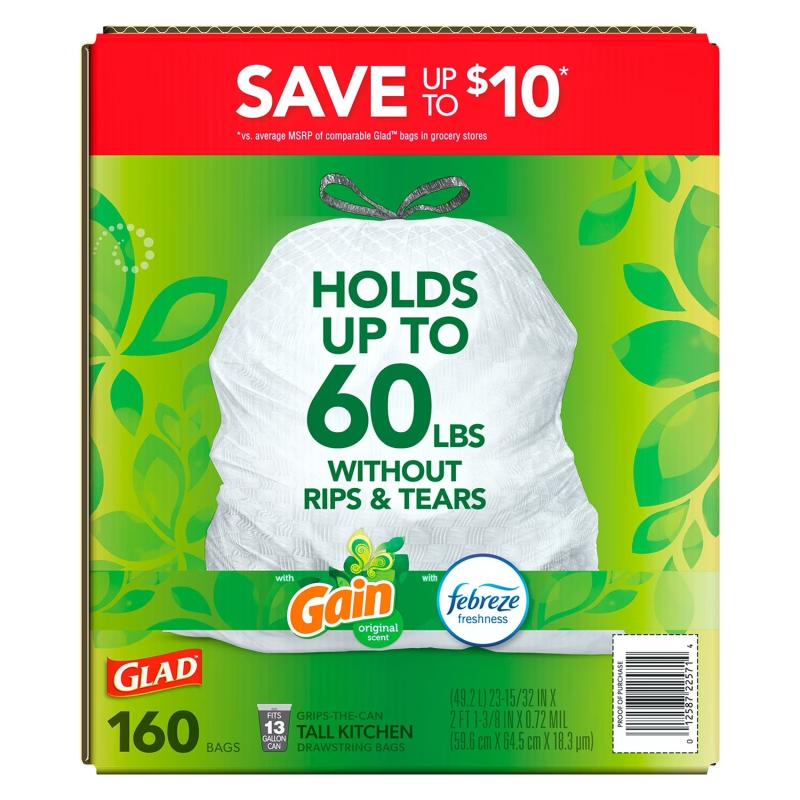 Glad® ForceFlex Tall Kitchen Drawstring Trash Bags, Gain Original scent with Febreze Freshness, 13 Gallon, 160 ct.