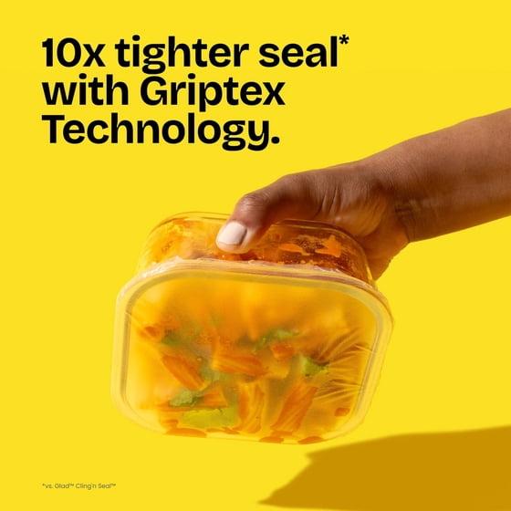 - GRIPTEX TECHNOLOGY: Glad Press'N Seal Griptex technology works to cover and stretch to across plastic, paper, wood, metal, glass and keeps food fresh while protecting against leaks or spills with ease