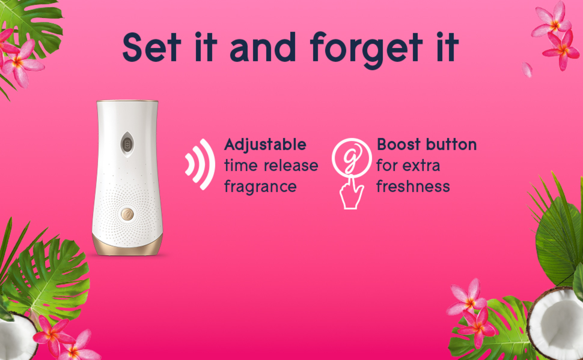 - Life's a Beach with Glade automatic spray with notes of monoi blossoms, melon and coconut milk