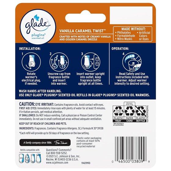 Glade PlugIns Refills Air Freshener, Scented and Essential Oils for Home and Bathroom, Vanilla Caramel Twist, 1.34 Fl Oz, 2 Count