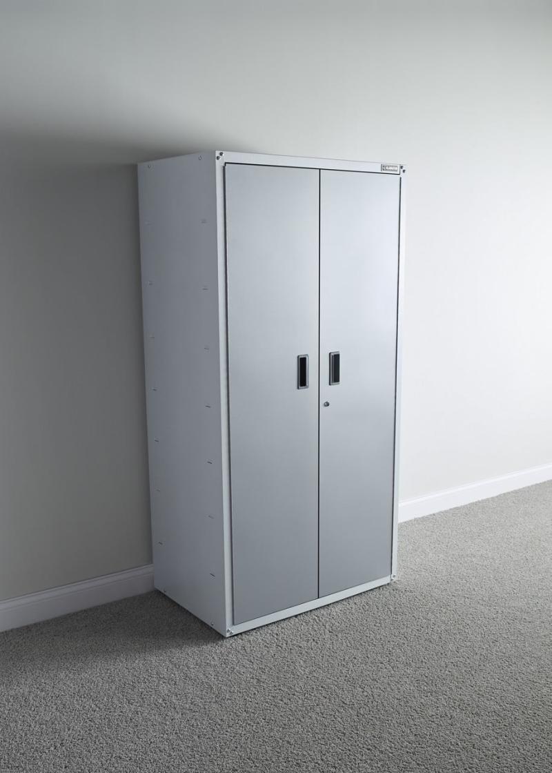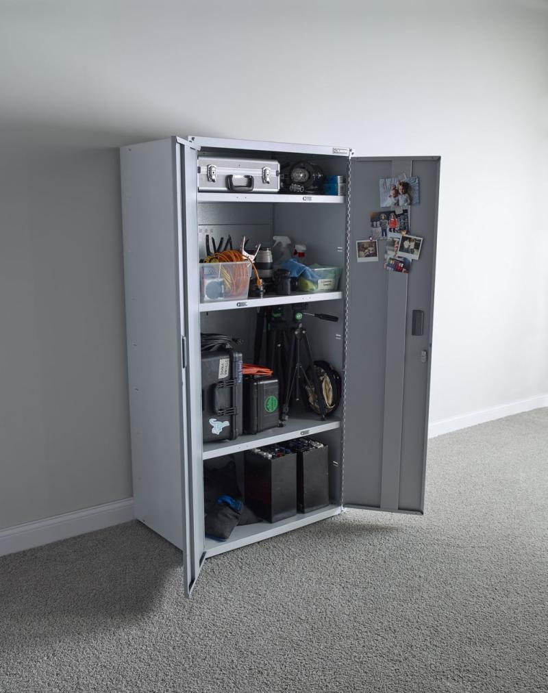 - Heavy-duty steel cabinet with hammered granite finish and matching doors