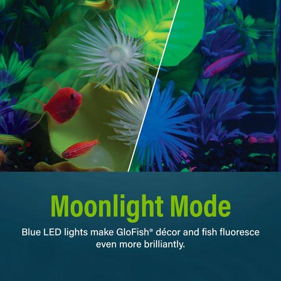 - BLUE LED LIGHTS: Hidden blue LED lights are incorporated into the hood, giving your GloFish fluorescent fish an exciting and uniquely fluorescent look.