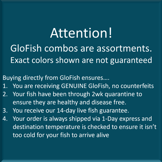 All orders are shipped via overnight shipping. If your total GloFish live fish order is over $99, shipping is free! Look for our 3ct Add-On packs to increase your order total and get free shipping.