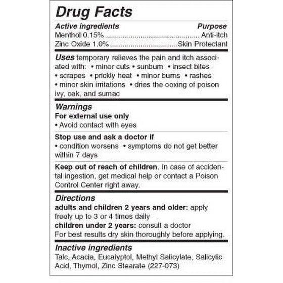 Active Ingredients: Menthol 0.8%; Zinc Oxide 5.0. Inactive Ingredients: Talc; Acacia; Eucalyptol; Methyl Salicylate; Salicylic Acid; Thymol; Zinc Stearate