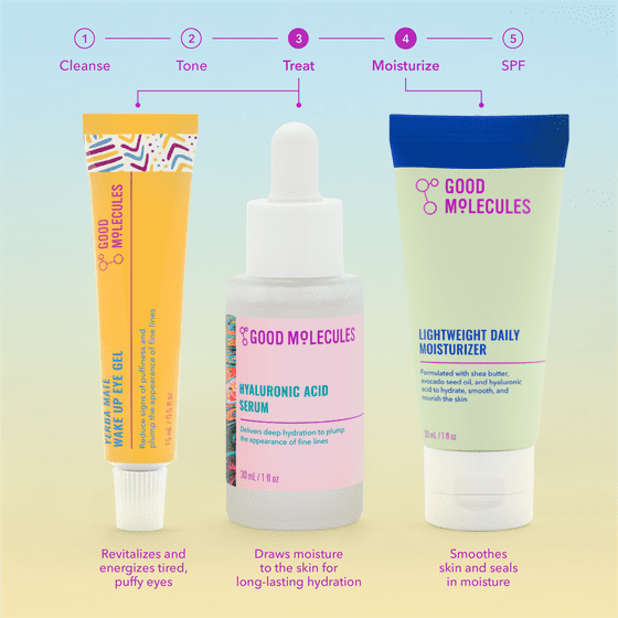 Hyaluronic Acid Serum: Aqua/Water/Eau, Propanediol, Glycerin, Sodium Hyaluronate, Hydroxyacetophenone, Sodium Citrate, Citric Acid, Ethylhexylglycerin, Tocopherol. Yerba Mate Wake Up Eye Gel: Aqua/Water/Eau, Propanediol, Butylene Glycol, Glycerin, 1,2-Hexanediol, Sodium Polyacryloyldimethyl Taurate, Cetyl Ethylhexanoate, Corn Starch Modified, Ilex Paraguariensis Leaf Extract, Cetearyl Olivate, Sorbitan Olivate, Adenosine, Panthenol, Allantoin, Tocopherol, Helianthus Annuus (Sunflower) Seed Oil, Hydrolyzed Hyaluronic Acid, Sodium Hyaluronate, Hyaluronic Acid, Caffeine, Acetyl Tetrapeptide-5, Cichorium Intybus (Chicory) Root Extract. Lightweight Daily Moisturizer: Aqua/Water/Eau, Propanediol, Butyrospermum Parkii (Shea) Butter, Neopentyl Glycol Diheptanoate, Cetearyl Alcohol, 1,2-Hexanediol, Cetearyl Olivate, Persea Gratissima (Avocado) Oil, Cetyl Ethylhexanoate, Glyceryl Stearate, Sorbitan Olivate, Carbomer, Tromethamine, Sodium Hyaluronate, Tocopheryl Acetate, Ethylhexylglycerin, Trisodium Ethylenediamine Disuccinate, Camellia Sinensis Leaf Water.